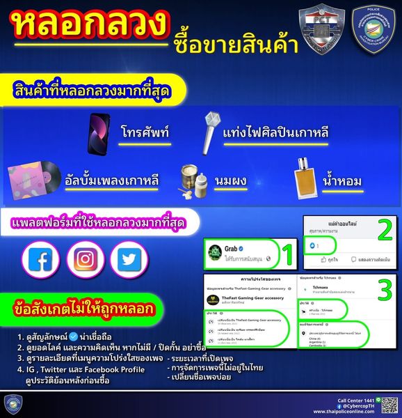 สำหรับตัวอย่างของพฤติกรรมของคดี “หลอกลวงซื้อขายสินค้า” นั้น พบว่าสินค้ายอดซื้อขายผ่านโซเชียลมากที่สุดคือ หลอกขายโทรศัพท์ หลอกขายแท่งไฟศิลปินเกาหลี หลอกขายอัลบั้มเพลงเกาหลี หลอกขายนมผง และหลอกขายน้ำหอม
