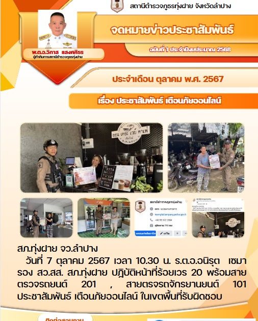 วันที่ 7 ตุลาคม 2567 เวลา 10.30 น. ร.ต.อ.อนิรุต เซมา รอง สว.สส สภ.ทุ่งฝาย ร้อยเวร 20 พร้อมสายตรวจรถยนต์ 201,101 ประชาสัมพันธ์ เตือนภัยออนไลน์ ในเขตพื้นที่รับผิดชอบ
