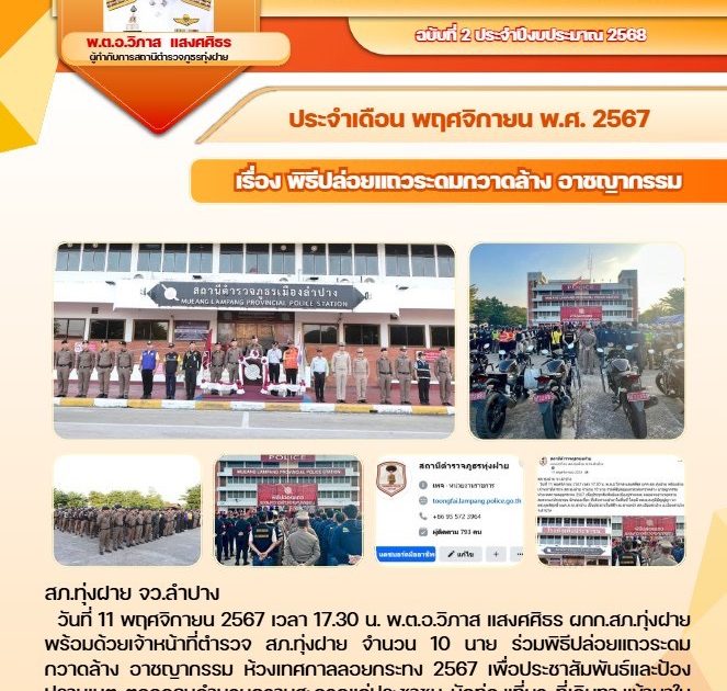 วันที่ 11 พฤศจิกายน 2567 เวลา 17.30 น. พ.ต.อ.วิภาส แสงศศิธร ผกก.สภ.ทุ่งฝาย พร้อมด้วยเจ้าหน้าที่ตำรวจ สภ.ทุ่งฝาย จำนวน 10 นาย ร่วมพิธีปล่อยแถวระดมกวาดล้าง อาชญากรรม ห้วงเทศกาลลอยกระทง 2567 เพื่อประชาสัมพันธ์และป้องปรามเหตุ ตลอดจนอำนวยความสะดวกแก่ประชาชน นักท่องเที่ยว ที่เดินทางเข้ามาในพื้นที่ โดยมี พล.ต.ต.ภูมิปัญญ์ญา นวตระกูลพิสุทธิ์ ผบก.ภ.จว.ลำปาง เป็นประธานในพิธีฯ ณ ลานหน้า สภ.เมืองลำปาง อ.เมืองลำปาง จ.ลำปาง