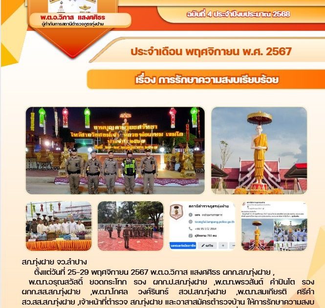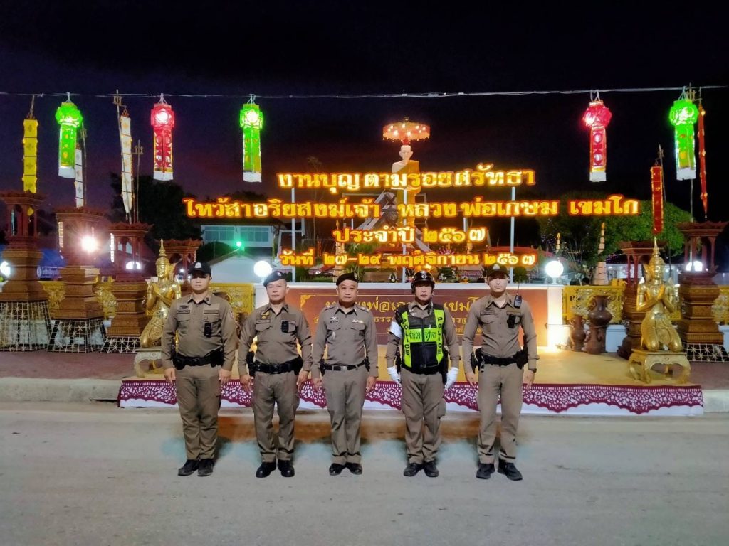 ตั้งแต่วันที่ 25-29 พฤศจิกายน 2567 พ.ต.อ.วิภาส แสงศศิธร ผกก.สภ.ทุ่งฝาย ,พ.ต.ท.อรุณสวัสดิ์ ยอดกระโทก รอง ผกก.ป.สภ.ทุ่งฝาย ,พ.ต.ท.พรวสันต์ คำปินโต รอง ผกก.สส.สภ.ทุ่งฝาย ,พ.ต.ท.โกศล วงศ์รินทร์ สวป.สภ.ทุ่งฝาย ,พ.ต.ท.สมเกียรติ ศรีคำ สว.สส.สภ.ทุ่งฝาย ,เจ้าหน้าที่ตำรวจ สภ.ทุ่งฝาย และอาสาสมัครตำรวจบ้าน ให้การรักษาความสงบเรียบร้อยความปลอดภัยในชีวิตและทรัพย์สินของประชาชนและนักท่องเที่ยว และอำนวยความสะดวกด้านการจราจร “งานบุญตามรอยศรัทธา ไหว้สาอริยสงฆ์เจ้า หลวงพ่อเกษม เขมโก ประจำปี 2567” ณ สถานปฏิบัติธรรม สุสานไตรลักษณ์ ต.ต้นธงชัย อ.เมืองลำปาง จ.ลำปาง