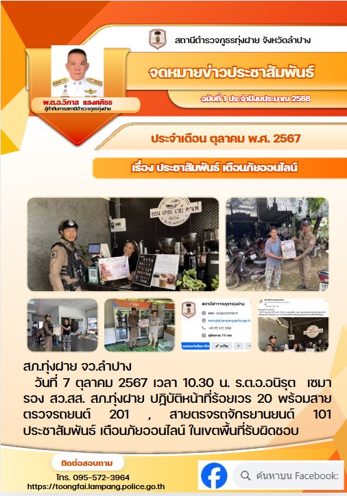 วันที่ 18 ตุลาคม 2567 เวลา 07.30 น. โดยการอำนวยการของ พ.ต.อ.วิภาส แสงศศิธร ผกก.สภ.ทุ่งฝาย ได้มอบหมาย