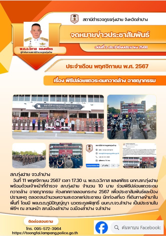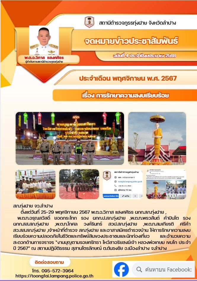 ตั้งแต่วันที่ 25-29 พฤศจิกายน 2567 พ.ต.อ.วิภาส แสงศศิธร ผกก.สภ.ทุ่งฝาย ,พ.ต.ท.อรุณสวัสดิ์ ยอดกระโทก