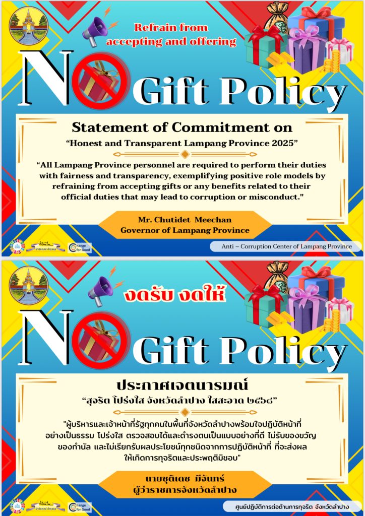 การประกาศเจตนารมณ์ ‘สุจริต โปร่งใส จังหวัดลำปางใสสะอาด 2568’ และ ‘งดรับ งดให้’ ของขวัญของกำนัลทุกชนิดจากการปฏิบัติหน้าที่ (No Gift Policy)