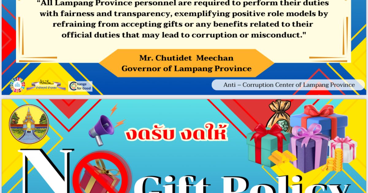 การประกาศเจตนารมณ์ ‘สุจริต โปร่งใส จังหวัดลำปางใสสะอาด 2568’ และ ‘งดรับ งดให้’ ของขวัญของกำนัลทุกชนิดจากการปฏิบัติหน้าที่ (No Gift Policy)