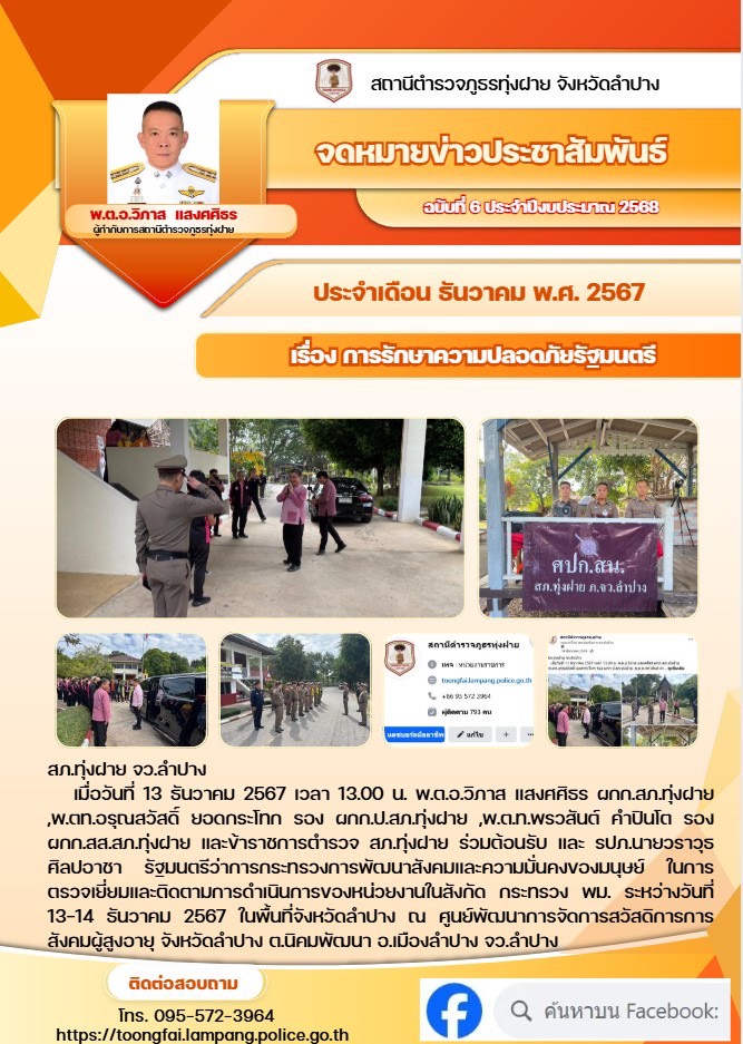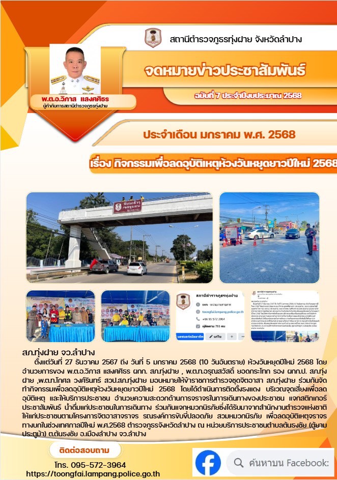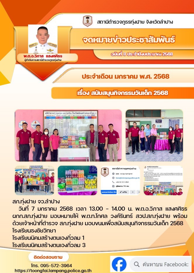 วันที่ 7 มกราคม 2568 เวลา 13.00 – 14.00 น. พ.ต.อ.วิภาส แสงศศิธร ผกก.สภ.ทุ่งฝาย มอบหมายให้ พ.ต.