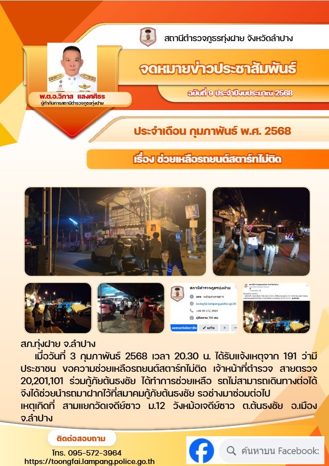 เมื่อวันที่ 3 กุมภาพันธ์ 2568 เวลา 20.30 น. ได้รับแจ้งเหตุจาก 191 ประชาชน ขอความช่วยเหลือรถยนต์สตาร์